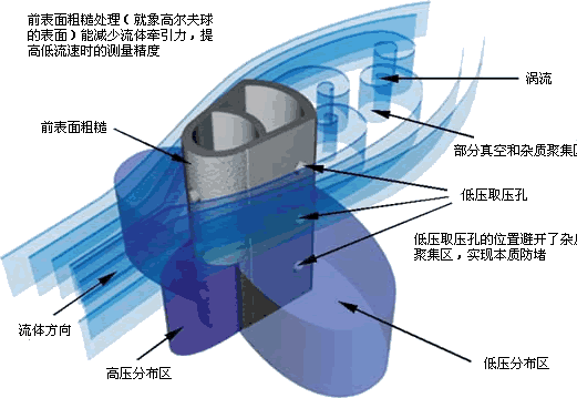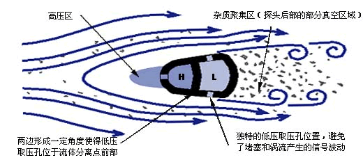 探頭的前部形成高壓區(qū),壓力略高于管道靜壓,阻止了顆粒進(jìn)入。請注意:在探頭的高壓取壓孔處流體的速度是零,沒有物體會(huì)進(jìn)入取壓孔。