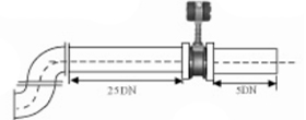 5.不同平面兩個(gè)彎管的安裝 如果流量計(jì)的前端有兩個(gè)90°彎頭,要保證流量計(jì)的前直管段≥25D,后直管段≥5D | | |||||||||||